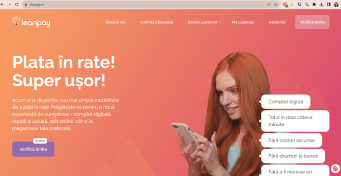 Imediat vei fi redirecționat către site-ul procesatorului de plăți Netopia, partener Leanpay, unde trebuie să urmezi instrucțiunile afișate pe pagina respectivă.