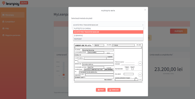 Pas 5 - Tipărește ordinul de plată sau folosește informațiile afișate pe ecran, în orice agenție bancară de pe teritoriul României a băncii unde ai cont curent deschis și activ și transferă rata către Leanpay, menționând la detaliile plății referința de plată aferentă contractului tău – vei găsi această referință în contractul de credit, art. 2.10 sau pagina 9-10 articolul 5.