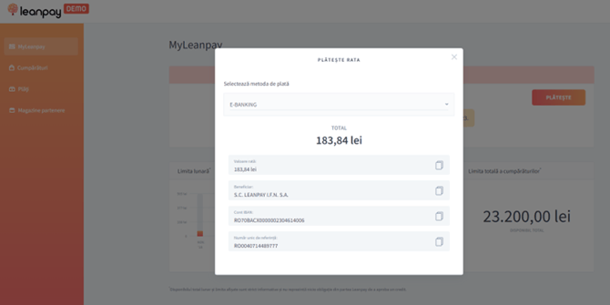 Pas 5 - Folosește informațiile afișate pentru a completa ordinul de plată din aplicația ta de internet/e-banking și efectuează transferul ratei către Leanpay, menționând la detaliile plații referința de plată aferentă contractului tău – vei găsi această referință în contractul de credit, art. 2.10 sau pagina 9-10 articolul 5.